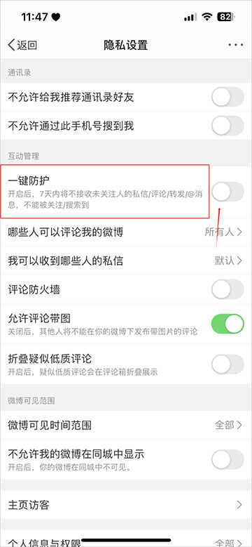 3、最后,进入隐私设置页面,点击打开一键防护开关按钮,这样对方就看不到我关注的人了。