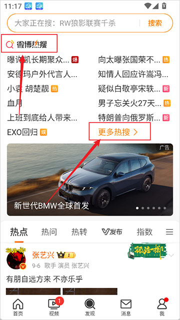 2、在发现页顶部或中部找到【热搜】入口,即可查看实时热搜总榜。如需查看更多分类榜单(如文娱榜、同城榜),点击【更多热搜】进入完整页面。