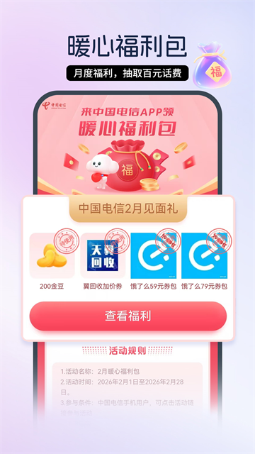 暖心福利包:抽至抽取百元话费、海量福利月月领不停。
