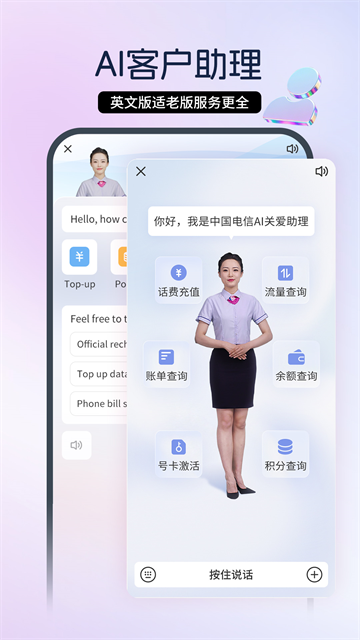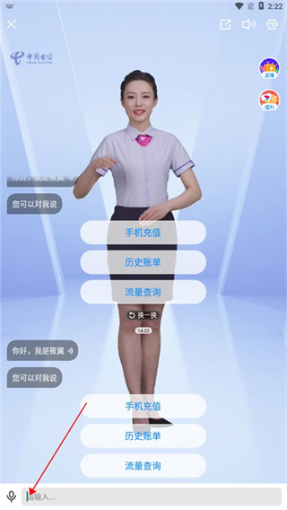1、在本站下载安装并打开中国电信App,在首页找到虚拟营业员进入页面。