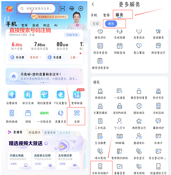1、第一步:打开中国电信APP,首页→更多→服务→便民→手机号码销户。或直接在首页搜索手机号码销户。