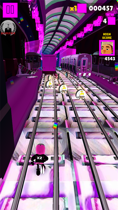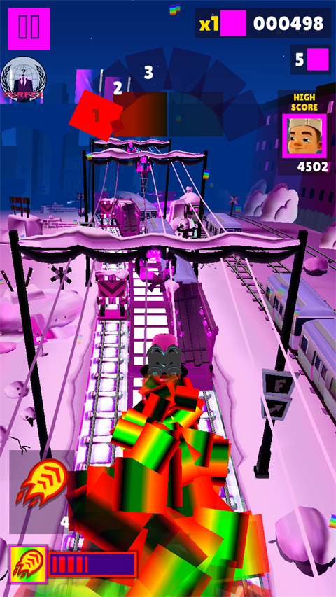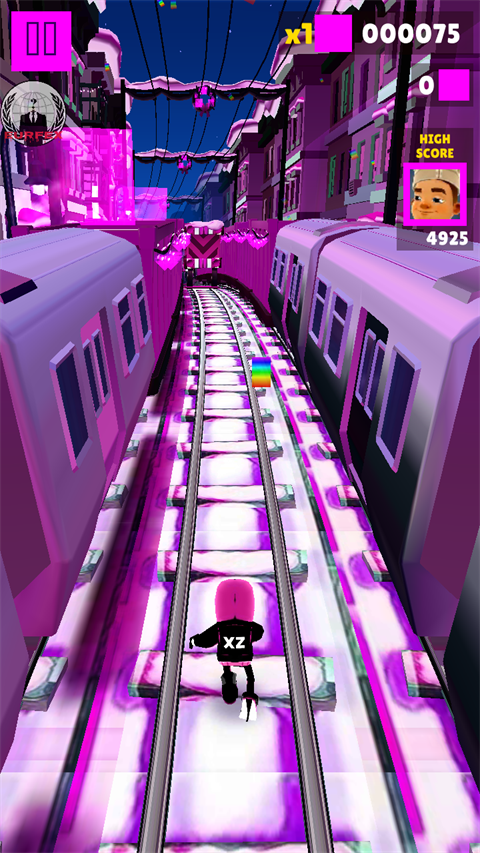 1、独树一帜的红紫视觉风格:游戏主色调全面革新,从地铁隧道到沿途背景,均采用精心调配的红紫渐变。这种大胆的配色不仅独特,更能有效减少视觉疲劳,让每一次冲刺都如同穿行于光影交织的梦幻之境。