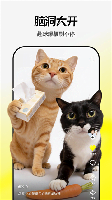 爱参与挑战、与好友互动,利用“真人+虚拟形象”双轨模式合拍趣味短片,增强社交趣味性。