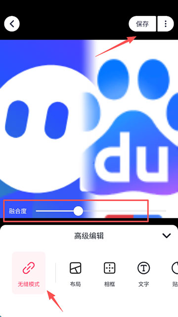 3、点击“无缝模式”,选择号融合度,然后点击“保存”,即可。