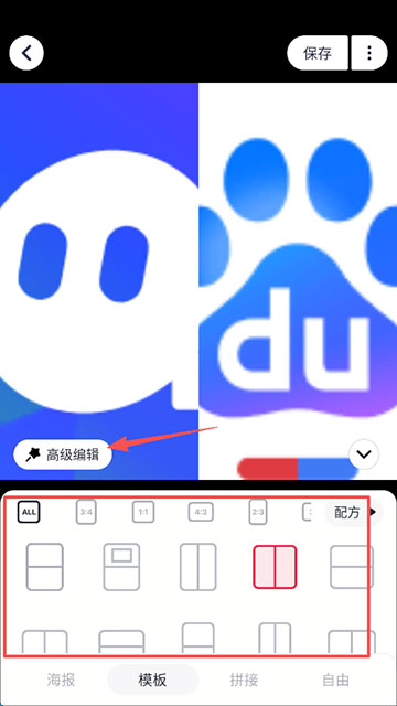2、选择您想要融合的两张照片,选择模板,然后点击“高级编辑”;