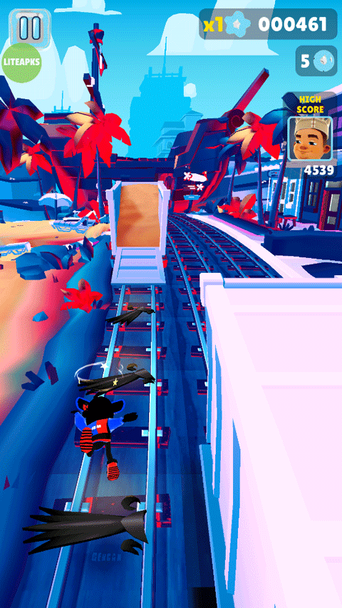 2、夏威夷风情地图:告别冰冷的工业城市,迎接你的是椰子树、冲浪板、火山岩和草裙舞。地图中充满了动态元素,例如突如其来的海浪会淹没铁轨,你需要及时跳上滑索躲避。