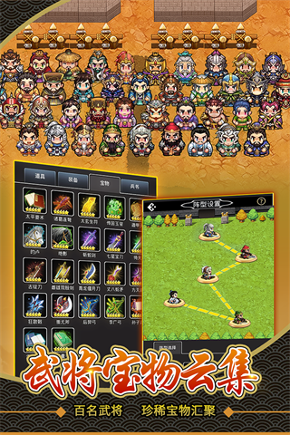 自由探索三国地图,触发随机事件,解锁神秘宝藏与传奇装备。