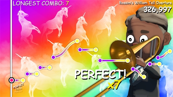 1、魔性的滑音操控机制:游戏核心玩法基于长号的伸缩管原理。玩家需要根据屏幕上的提示上下移动来调整音高,并配合按键吹奏。由于没有音阶吸附功能,稍不留神就会吹出极其刺耳且喜感的跑调声。