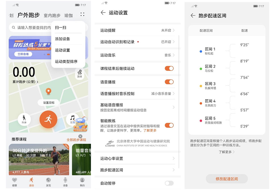 1、打开华为运动健康App,点击运动>点击户外跑步>点击右上角::,点击运动设置>跑步配速区间;