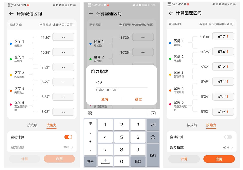 注:按跑力计算配速区间需要支持跑力的穿戴设备才能使用,跑力自动计算的跑力值来源于近期跑步数据的跑力值。