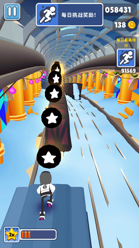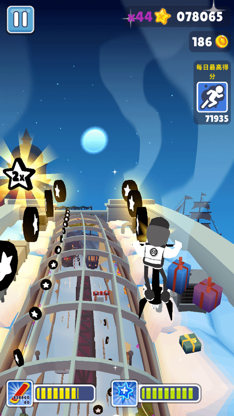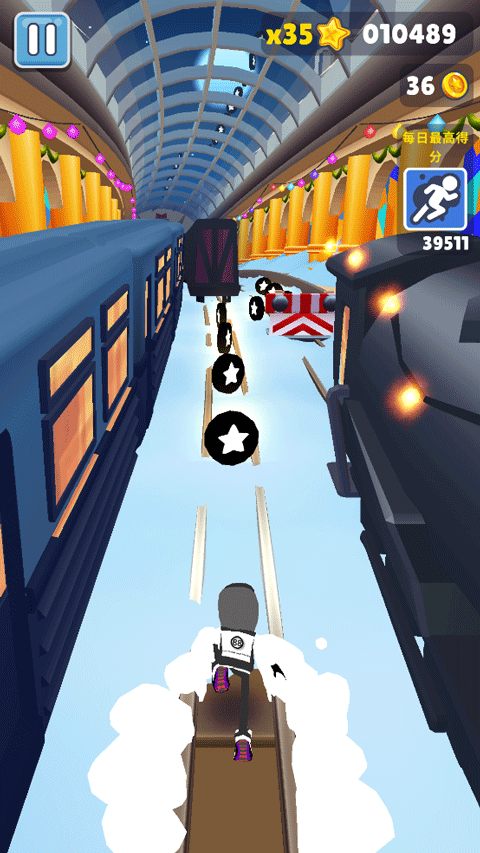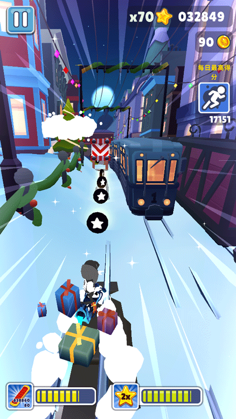 1、冬日主题场景:游戏地图焕然一新,整个世界披上了洁白的冬装。飘雪的湛蓝天空、挂满彩灯的圣诞树以及堆着雪人的站台,共同构成了唯美的奔跑背景,甚至连呼啸而过的火车头也换上了圣诞节风格的装饰 。