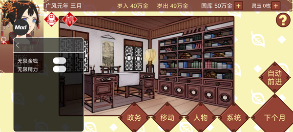 女帝的日常内置修改器版是一款非常好玩的经营养成类型手游。此版本为破解版,内置功能菜单,功能有:无限金钱、无限精力。你将穿越时空,成为刚刚登基的一国之君。朝堂之上,你需要运筹帷幄,制衡各方势力;深宫之中,你需明察秋毫,管理庞大的后宫体系。游戏将宫斗、朝政、养成与策略模拟巧妙融合,让你亲历从一名稚嫩女帝到一代传奇君主的蜕变之路。是成为流芳百世的明君,还是随心所欲的霸主,皆由你一念之间。快来体验女帝的日常生活吧。