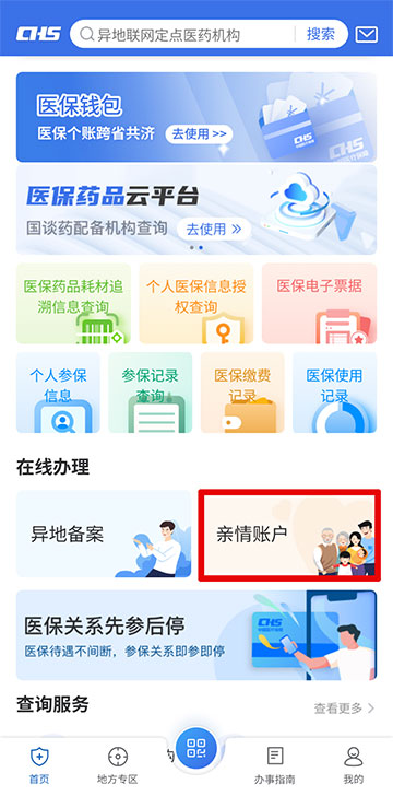 1、打开国家医保服务平台APP,首页点击【亲情账户】进入子账户页面;