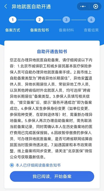 仔细阅读备案告知书,选中【本人已仔细阅读备案告知书】,点击【我已阅读,开始备案】按钮。
