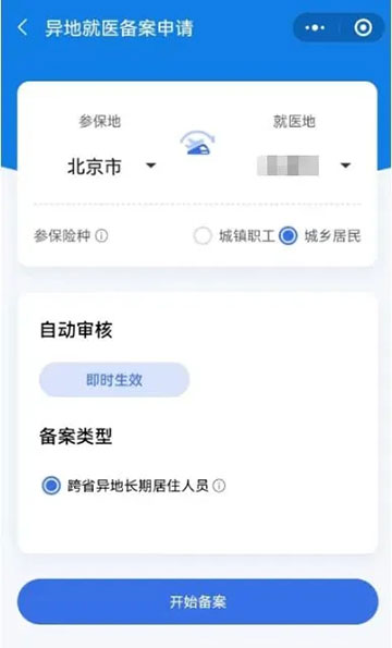 根据实际情况,选择“参保地”、“就医地”、“参保险种”及“备案类型”,点击【开始备案】按钮。
