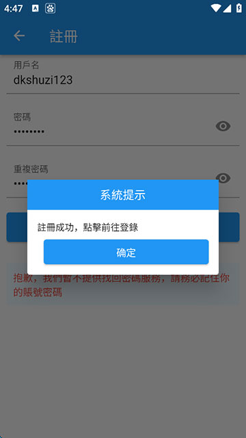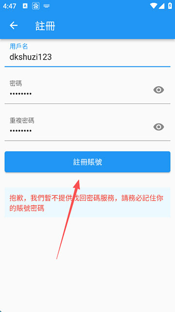 3、输入自己能够记住的用户名和密码(暂不提供找回密码服务,请务必记住账号密码),点击注册账号;