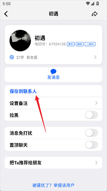 5、确认身份后点击【保存到联系人】,即可成功添加好友,开始聊天互动。