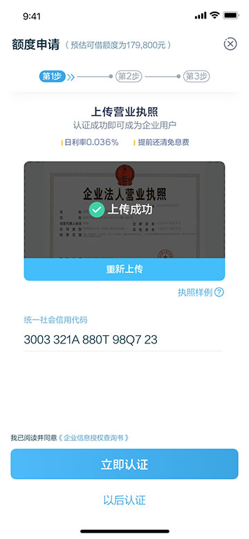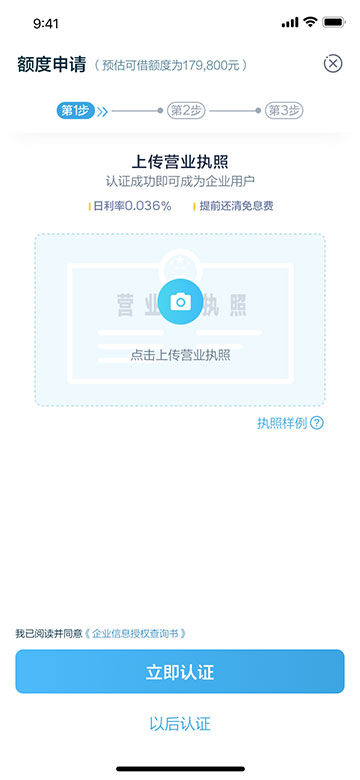 <温馨提示:请不要在流程内跳过上传营业执照哦,以免影响认证结果>