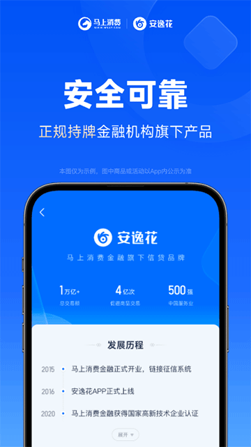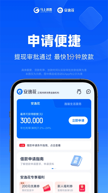 安逸花App安逸花App是马上消费金融股份有限公司旗下的一款正规的借钱平台,用户可以在额度范围内进行分期借款贷款,在享受安全、专业、智能、便捷贷款同时,可自主提现支付,在额度范围内进行分期贷款、消费借款(购房、购车除外)。并且安逸花App严格遵循监管规定,无任何贷前隐性费用,所有收费项目均有明确公示,申请额度、变更还款账户等基础服务均免费提供,充分保障用户知情权。 注意:贷款有风险,借款需谨慎,请依据个人能力...