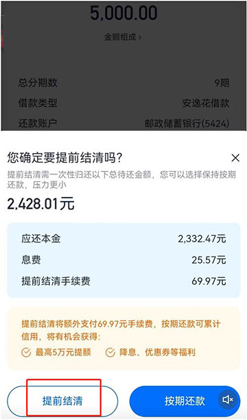 4、点击左下角【提前结清】按钮,按提示完成支付即可。