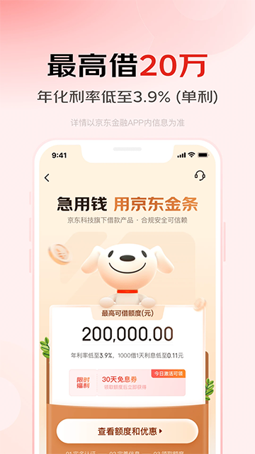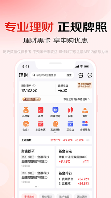 京东金融App是京东集团旗下的一款数字金融服务平台,集支付、理财、借贷、资讯、记账、消费等功能为一体。其中已推出白条、基金、银行理财、小金库、金条、联名小白卡、小金卡等在内的近万只金融产品,涵盖理财、借贷、保险、分期四大业务板块,在这里用户可以通过衡量自身的收益、流动性预期,直接匹配理财产品,让理财变得更简单。此外,京东金融App依托京东科技技术能力,保障用户资金安全,提升用户体验。京东金融App“让小白都轻松理财”。需要的用户欢迎下载使用!