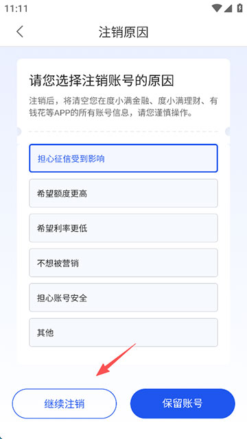 6、选择账号注销原因,点击“继续注销”;