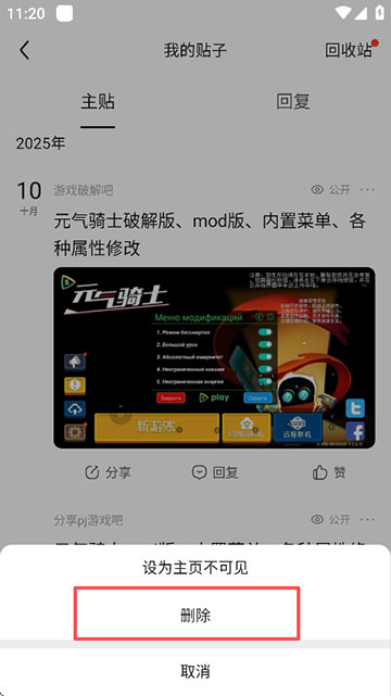 3、找不需要删除的帖子,点击帖子右上角的三点图标,然后点击“删除”即可。