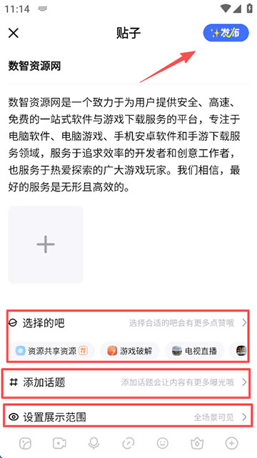 2、输入标题、内容后还可以选择吧、添加话题、设置展示范围等,完成后点击“发布”即可。