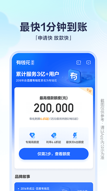 有钱花App是百度旗下的一款金融借款App,有网络小额贷款牌照,与30余家持牌金融机构联合放贷,资金来源合规可靠。同时利用人工智能和大数据风控技术,为用户提供方便、快捷、安心的借款服务。在这里您仅需填写身份信息,提交材料后快至30秒即可获得借款额度,额度高达200,000元,日息0.02%起,贷款借钱就找“有钱花”,随时借款提前还款无违约金,还可以灵活选择分期方式!
