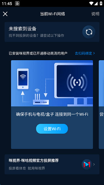 3、自动搜索可以投屏的设备,如果要投屏到电视上,需要把电视打开,且打开无线投屏功能,和手机连接的是同一个wifi。