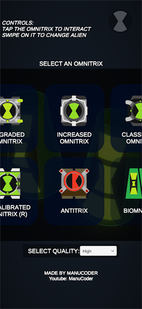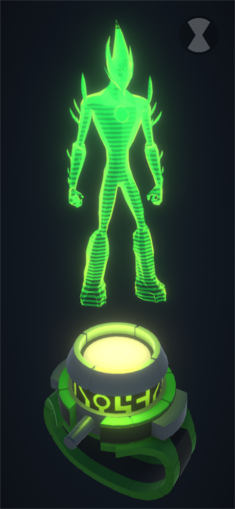 2、表盘核心,沉浸式交互体验:高度拟真的Omnitrix手表界面,全3D建模,可旋转表盘。你可以通过手指滑动来切换英雄头像,点击启动变身,并伴有标志性的“变身音效”和全屏特效,仿佛真的戴上了那块万能手表。