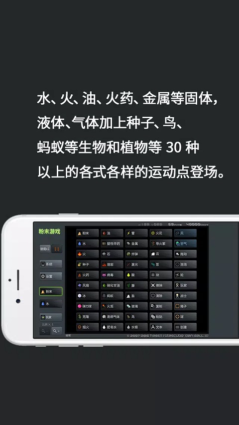 1、海量元素,真实互动:游戏内含超过几十种不同属性的元素,如粉末、液体、气体、固体等。每种元素都遵循着独特的物理规则,比如水往低处流、火药遇火会爆炸、植物需要水分才能生长。