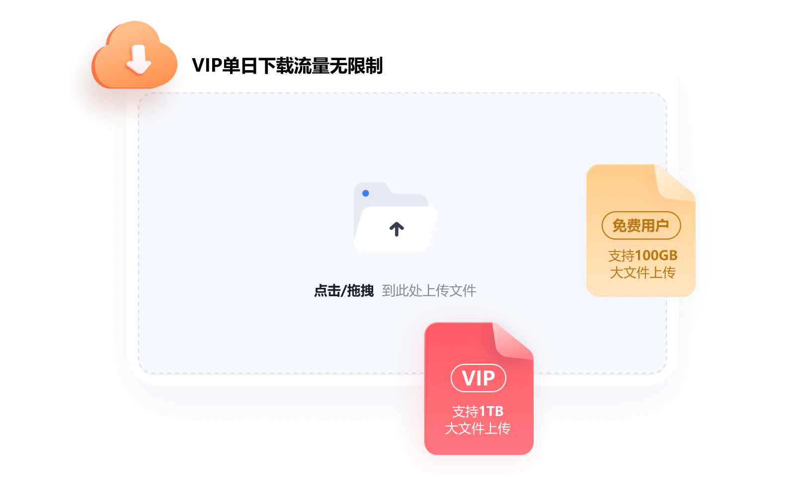 行业领先,免费用户支持100GB大文件上传,VIP会员支持1TB大文件上传,VIP单日下载流量无限制
