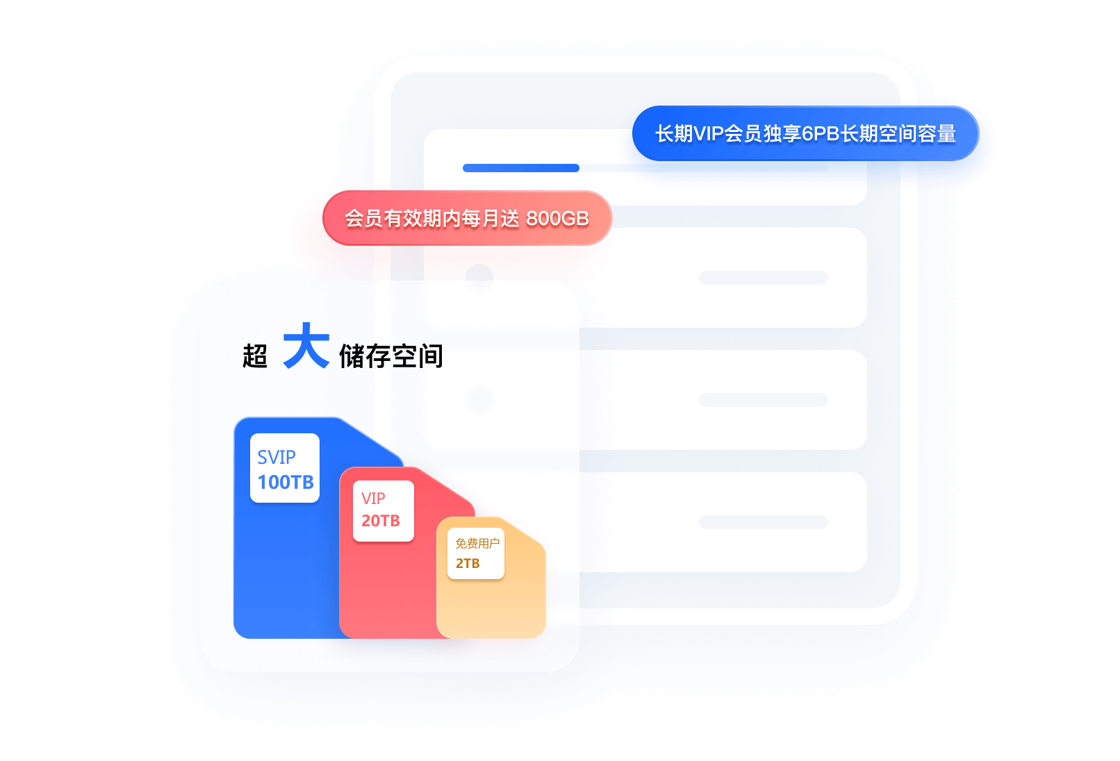 免费用户注册即送2TB容量,VIP享20TB容量,SVIP享100TB容量,长期VIP享6PB超大容量,会员有效期内,每月额外赠送800GB成长容量