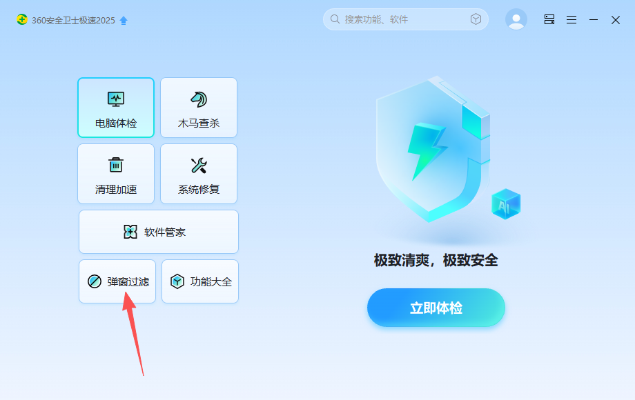1、打开360安全卫士极速版进入软件主界面,直接点击“弹窗过滤”