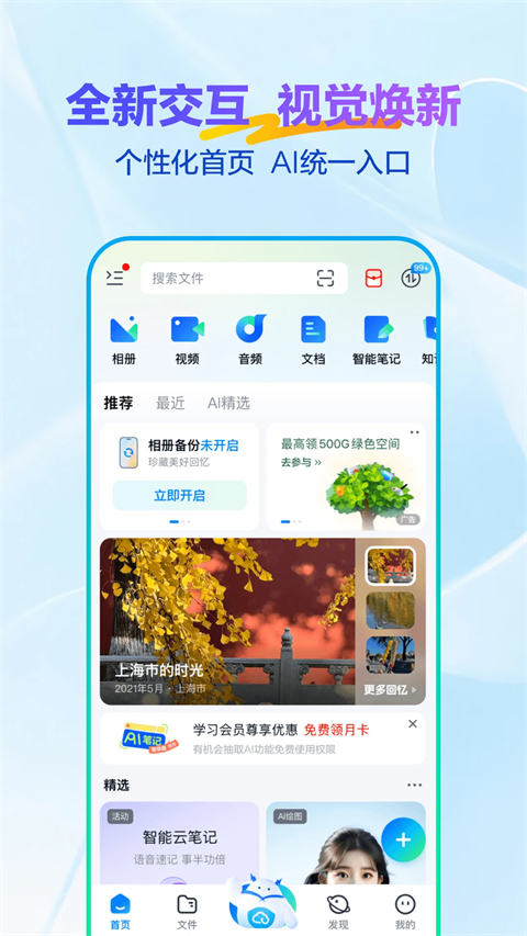 AI工具,打造更懂你的云盘。智能搜图,言出图现;智能云笔记,学习办公好效率神器;个人知识库,我的专属知识管家;智能绘图,美图、上色、消除、扩图,一键创作。AI形象照,全网最火模版,让你创意出圈。
