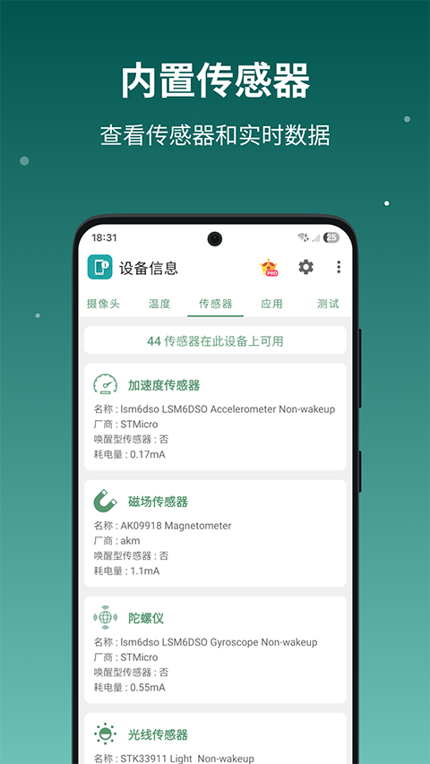 4、真实传感器检测:通过内置的传感器列表,用户可以直观地看到手机配备的传感器类型(如陀螺仪、加速度计、磁力计等),并通过图表查看其实时数据波动,判断传感器是否失灵。