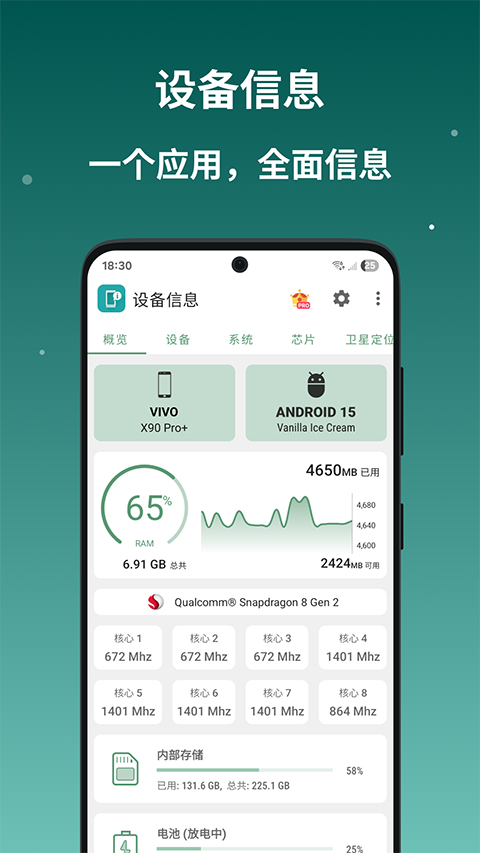 1、设备概览:汇总显示设备型号、安卓版本、内核版本、Build号、RAM大小、ROM大小及当前可用空间。