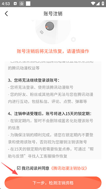 4、勾选已阅读并同意注销协议,点击“下一步,检测注销资格”;