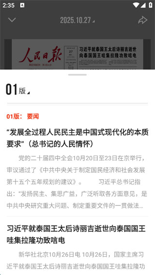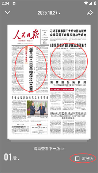 2、就可以看报纸了,想要看哪一个板块,可以直接点击进入,或者点击屏幕右下角的“读报纸”;