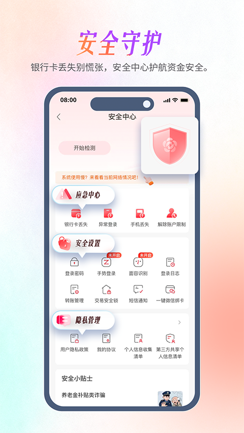 4、安全守护:创新推出应急中心,针对手机丢失、异常登录等突发风险提供一键挂失解决方案;安全小贴士以图文形式普及防诈知识。