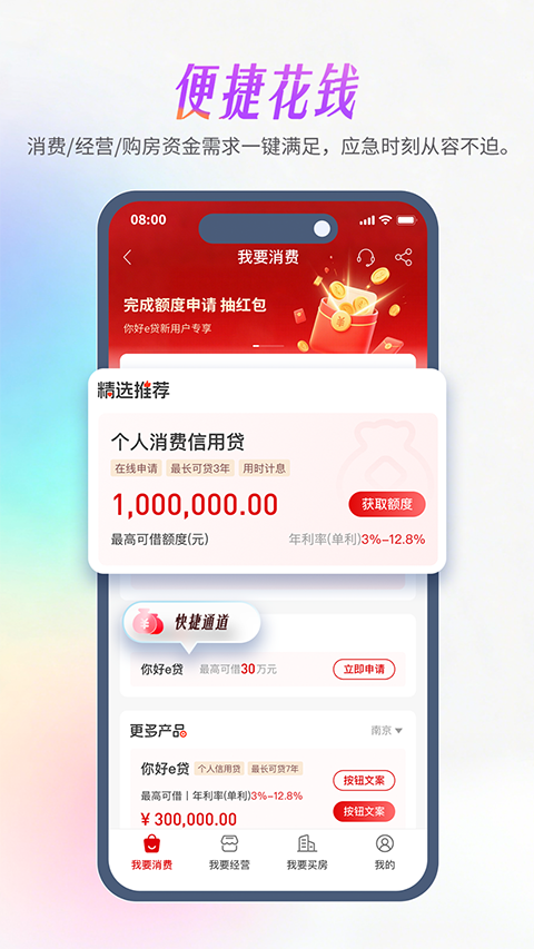 2、便捷花钱:搭建我要消费/经营/买房三大场景化贷款产品线,支持全流程线上办理。信用卡专区整合账单分析功能,帮助用户优化资金使用效率。