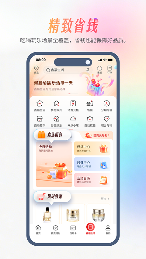 3、精致省钱:重构鑫福生活专区,整合每日特价、限时优惠、积分兑换等福利。支持周边商户优惠券查找和品牌好物积分抵扣。