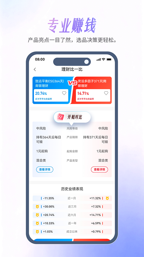 1、专业赚钱:推出理财比一比功能,支持从收益、风险、期限等多维度横向对比产品。私行客户可一键触达财富顾问,享受千人千面的资产配置方案。