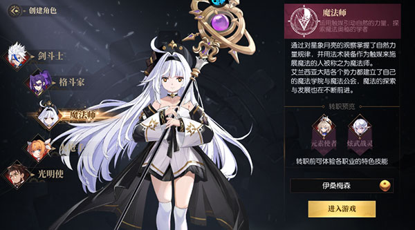 2、创建角色,选择喜欢的职业,并设置角色名称,点击“进入游戏”;