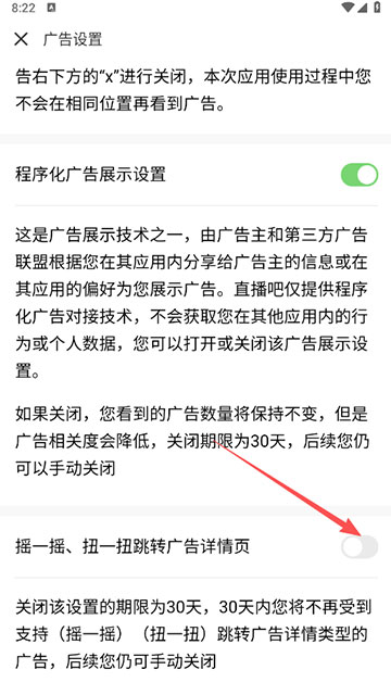 6、取消“摇一摇、扭一扭跳转广告详情页”,关闭期限为30天,后续您仍可以手动关闭。