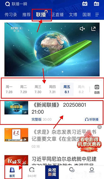 1、打开后就是首页,在首页的最上方有个“联播”,点击“联播”,中间有“周一,周二”等日期,想看哪天的新闻就点哪天,紧挨着日期下面的视频,点进去看了。