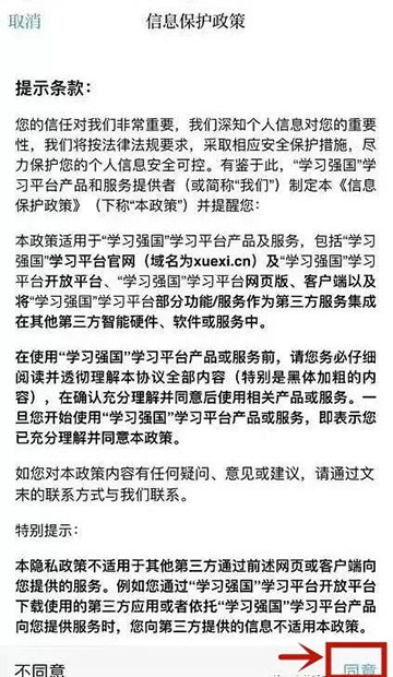 3、阅读完“信息保护政策”后,点击右下角“同意”;