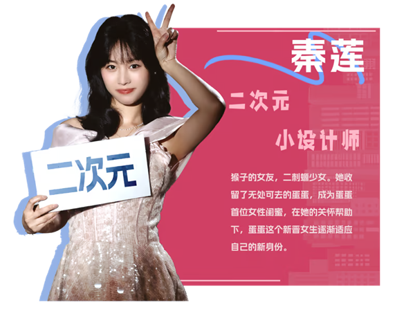 猴子的女友,二刺螈少女。她收留了无处可去的蛋蛋,成为蛋蛋首位女性闺蜜,在她的关怀帮助下,蛋蛋这个新晋女生逐渐适应自己的新身份。