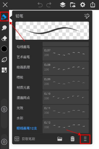 1、打开画世界,新建画布后,点选画笔工具工具,调出画笔设置工具栏,点先右下角三点,如下图。